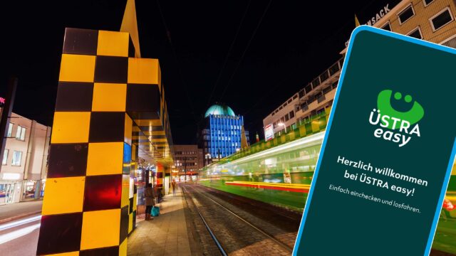 Die neue App „ÜSTRA easy“ macht Tarifzonen und Preisvergleiche überflüssig. Ein Klick genügt zum Einchecken; das Fahrtende erkennt die App automatisch per GPS und Bluetooth-Beacons. Abgerechnet wird nach einem transparenten Luftlinien-Tarifmodell.